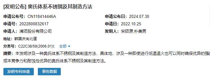 2024年7月30日,浦項股份有限公司成功申請一項名為“奧氏體系不銹鋼及其制造方法”專利,申請公布號為CN118414446A,申請日期為2022年10月25日。