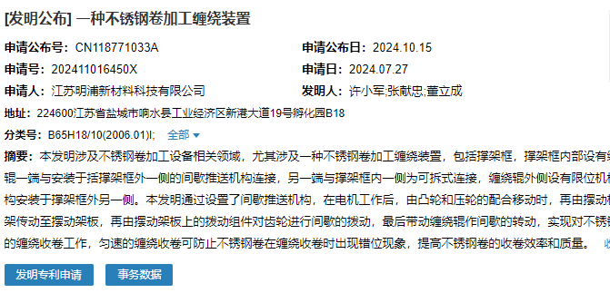 2024年10月15日,江蘇明浦新材料科技有限公司成功申請(qǐng)一項(xiàng)名為“一種不銹鋼卷加工纏繞裝置”專利,申請(qǐng)公布號(hào)為CN118771033A,申請(qǐng)日期為2024年7月27日。