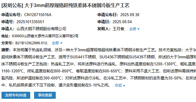 2025年9月30日,山西太鋼不銹鋼股份有限公司成功申請一項名為“大于3mm超厚規格超純鐵素體不銹鋼冷板生產工藝”專利,申請公布號為CN120715016A,申請日期為2025年8月4日。