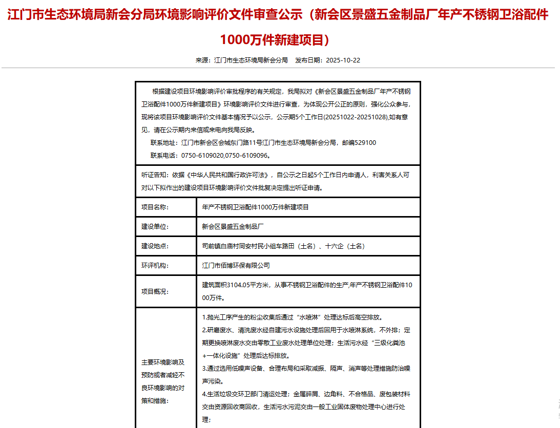 2025年10月22日,江門市生態環境局新會分局就新會區景盛五金制品廠年產不銹鋼衛浴配件1000萬件新建項目環境影響評價文件進行審查公示,公示期:5個工作日。