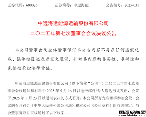 近日,中遠海運能源運輸股份有限公司發布公告稱,公司于5月23日召開2025年第七次董事會會議,審議并通過《關于上海能化投資新造1艘9200載重噸化學品船的議案》。