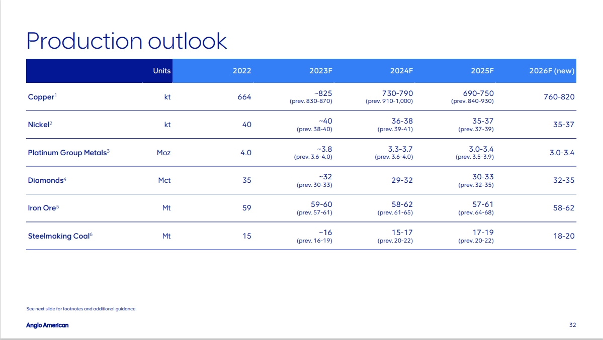 當地時間12月8日,英美資源(Anglo American)宣布將2023年的鎳產量指導從3.8-4萬噸調整為約4萬噸,2024年的鎳產量指導從3.9-4.1萬噸下調至3.6-3.8萬噸,2025年的產量指導從3.7-3.9萬噸下調至3.5-3.7萬噸,2026年的產量指導為3.5-3.7萬噸。鎳產量受到品位下降的影響。