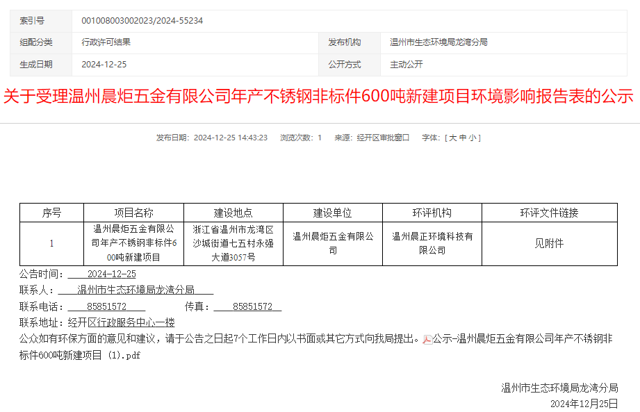 2024年12月25日,溫州市生態環境局龍灣分局受理溫州晨炬五金有限公司年產不銹鋼非標件600噸新建項目環境影響報告表并對外進行公示,公示期:7個工作日。
